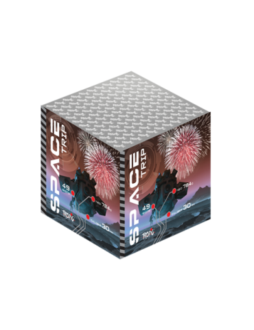 Le Space trip 2, 49 départs puissants avec une splendide dominance clignotante rouge et blanche, avec énorme bouquet final crépitant ainsi qu'une salve dorée.