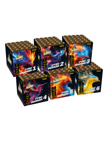 Fantastique coffret composé de 6 compacts 25 coups aux effets pailletés : or cuivré avec stroboscopes, or jaune avec pointes colorées, palmier pailleté, pivoine avec craquelures, et effets fantômes blancs et rouges.