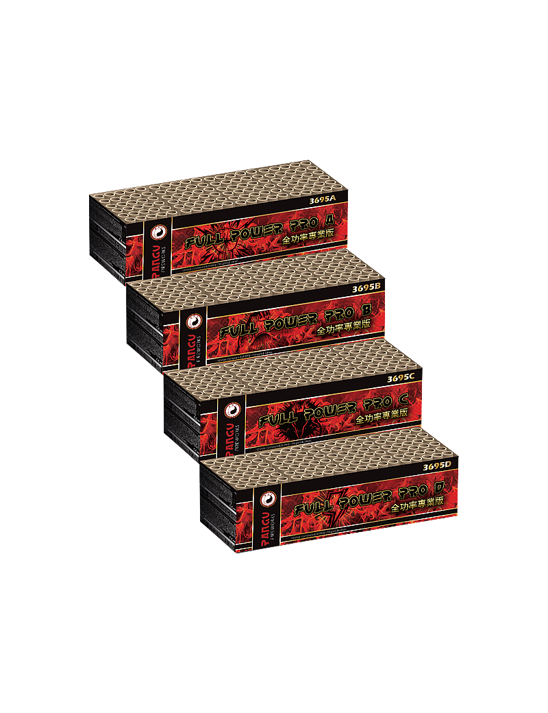 Full Power Pro est composé de quatre blocs de 120 tirs chacun. Vous lancerez un total de 480 tirs des plus beaux feux d'artifice de différents produits Pangu. Le tout à une vitesse incroyable, avec des volées qui s'enchaînent de plus en plus vite. Quelle puissance !
