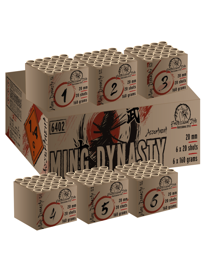 Un trésor de la pyrotechnie. Une élégance impériale. Le MING DYNASTY est une fresque historique peinte dans le ciel. Ce coffret est composé des 6 compacts à assortir à votre goût.