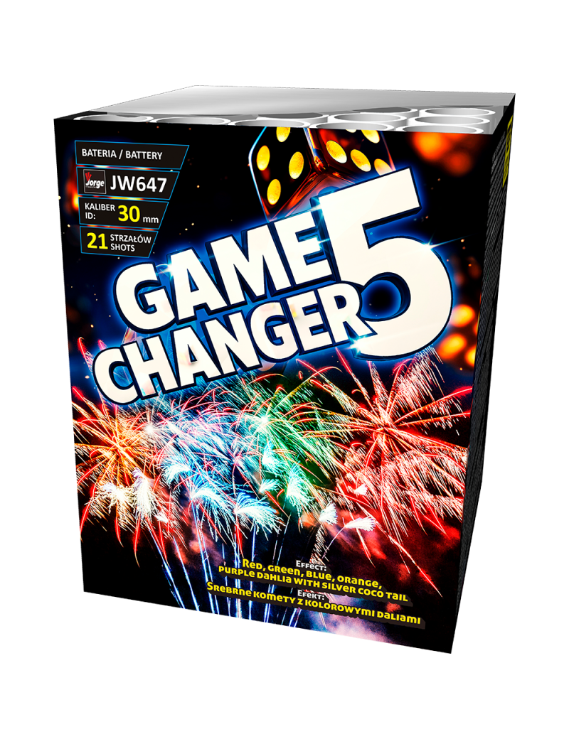 Propulsez vos célébrations dans une autre dimension avec le JW647 Game Changer 5. Ce concentré de puissance déchaîne un ballet frénétique de pivoines bleu, rouge, vert, violet avec tronc.